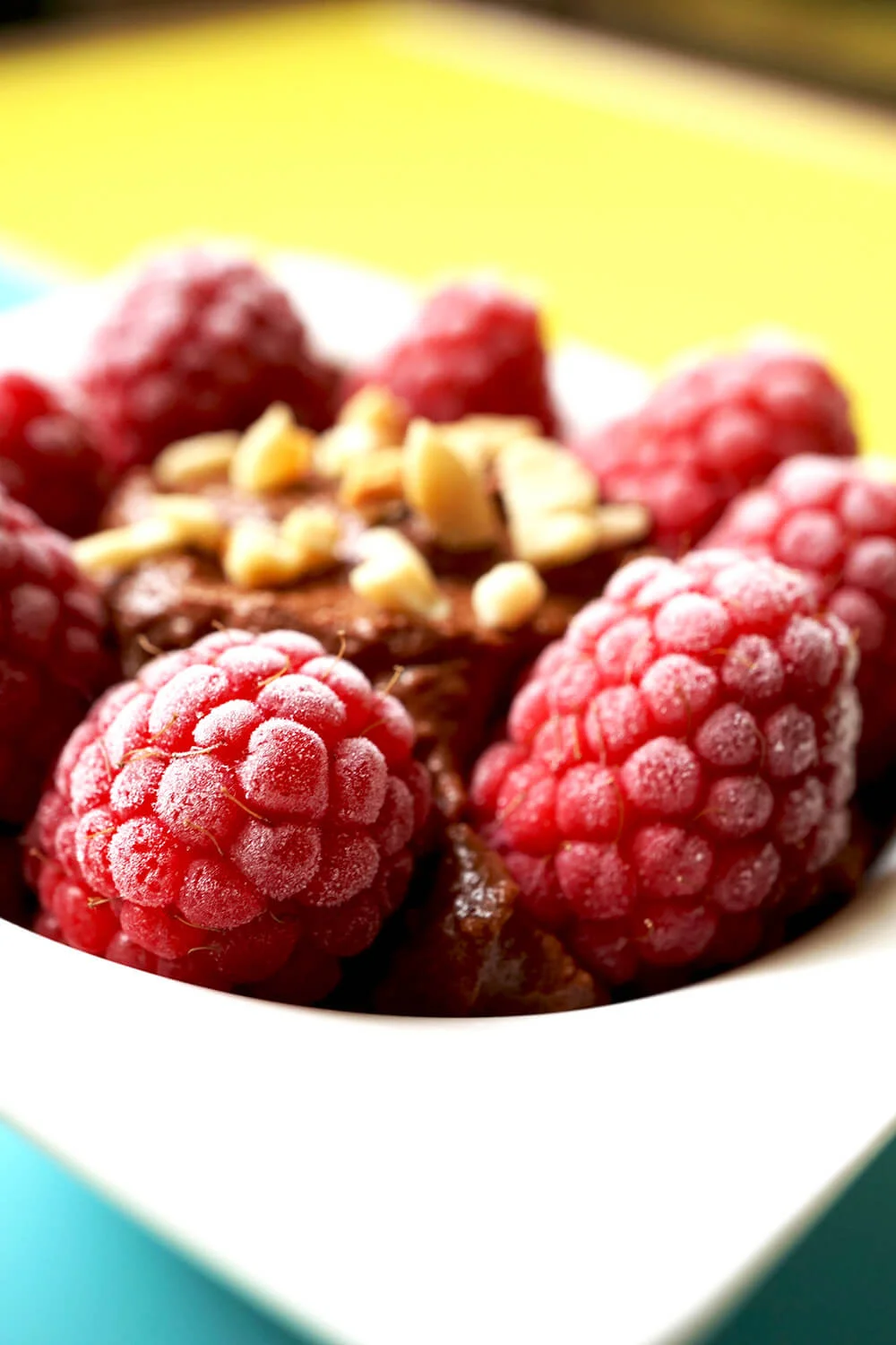 Top each mousse with a handful of frozen raspberries and a scattering of nuts just before serving
