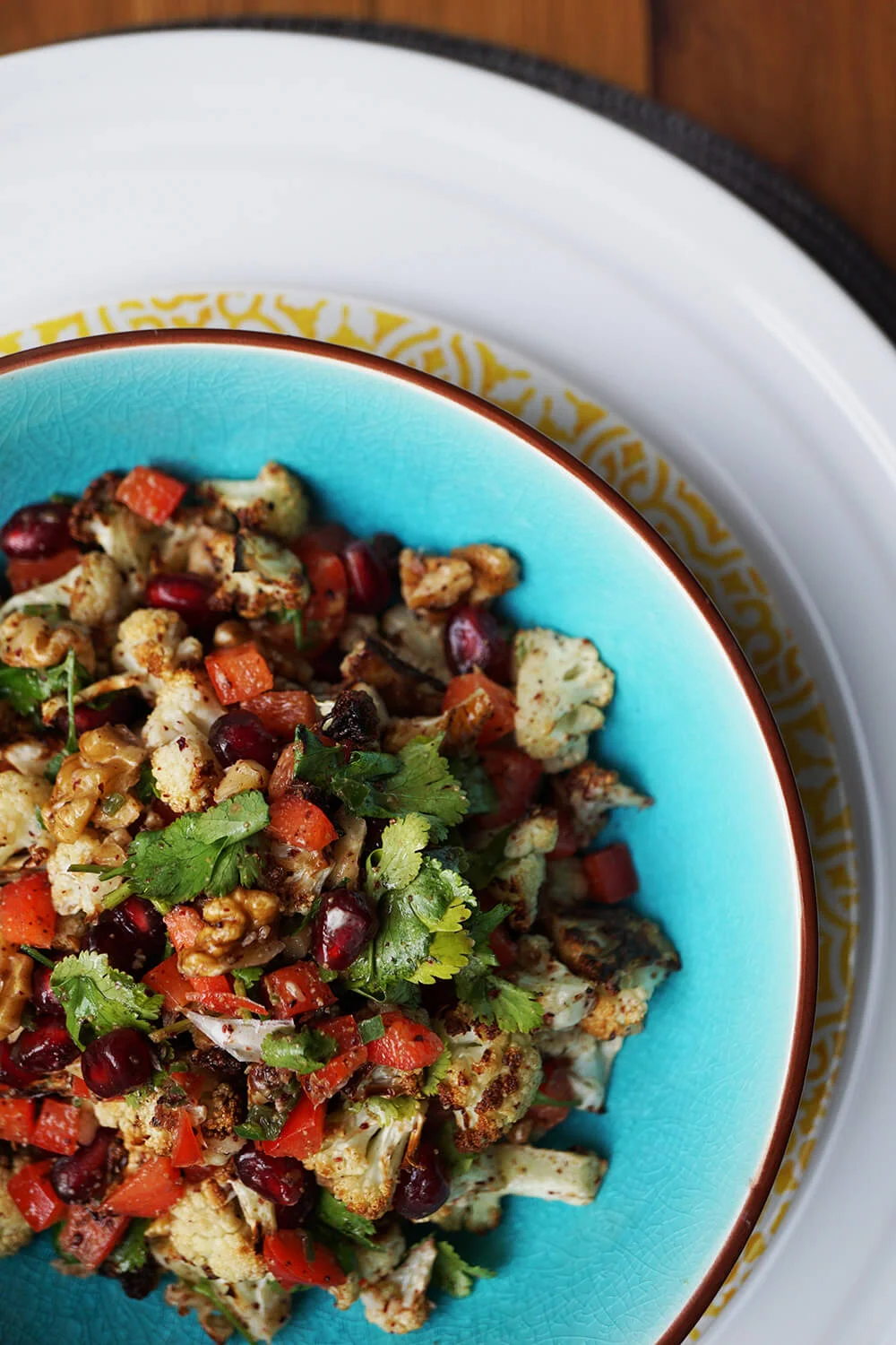 Add all of the remaining ingredients to the bowl with the baked cauliflower. Mix well and taste to see if you need to add more salt.